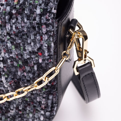 La Vaguette è una borsa sofisticata ed elegante caratterizzata da una silhouette morbida e leggermente curva che la rende perfetta per ogni occasione realizzata in tessuto ciniglia melange e riporti in pelle vitello. Questa borsa esprime lusso e artigianalità made in Italy
